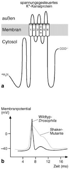 Shakerm, Gen auf dem X-Chromosom von Drosophila melanogaster, das für ein spannungsgesteuertes K+-Kanalprotein (Kaliumkanäle) codiert ( vgl. Abb. a). Wenn man Shaker-Mutanten mit Ether narkotisiert (Narkose), zittern die Tiere heftig aufgrund einer defekten motorischen Steuerung. Nach Mutationen im Shaker-Locus entsteht in den Axonen bestimmter Neuronen (Nervenzelle) ein anomal langes Aktionspotential ( vgl. Abb. b). Dies beruht auf einer fehlerhaften Repolarisation der Membran wegen defekter K+-Kanäle, die sich normalerweise unmittelbar nach der Depolarisation öffnen. Aus dem Primärtranskript des Shaker-Gens entstehen nach alternativem Spleißen mindestens 5 verschiedene Polypeptide, die im Xenopus-Oocyten-Expressionssystem – vermutlich als Homotetramere – K+-Kanäle bilden. Diese sind unterschiedlich spannungsabhängig und transportieren in verschiedenem Ausmaß K+-Ionen. Aus diesem Grund können in einzelnen Neuronen wegen der unterschiedlichen Expression des Shaker-Gens verschiedene Aktionspotentiale entstehen. Darüber hinaus wurden bei Drosophila noch 3 weitere Gene gefunden, die homolog zum Shaker-Gen sind, nämlich Shal, Shaw und Shab. Während Shaker und Shal für K+-Ströme vom A-Typ verantwortlich sind, codieren Shaw und Shab für delayed-rectifier-K+-Kanäle. Heteromultimere als Kanalproteine wurden bisher noch nicht beobachtet. Im Unterschied zu Drosophila wird bei Säugern die Vielfalt der möglichen K+-Kanäle nicht durch alternatives Spleißen erreicht, sondern es liegen jeweils mehrere, zu einer Unterfamilie gehörende Gene vor. Bei der Maus kennt man 12 Shaker-Gene, 4 Shaw-Gene, 2 Shal-Gene und 1 Shab-Gen. Auch bei Weichtieren wurden Gene dieser 4 Unterfamilien gefunden.