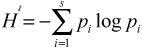 zur Charakterisierung von Artengemeinschaften verwendet (Diversität [Tab.]). H' berücksichtigt neben der absoluten Artenzahl s auch die relative Häufigkeit einer Art pi (Abundanz). H' ist ein Maß für die Unsicherheit, die Artzugehörigkeit eines bestimmten Individuums einer Artengemeinschaft vorhersagen zu können, und erreicht ein Maximum bei Gleichverteilung.