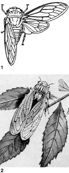 1 Gemeine Zikade (Cicada plebeja, Lyristes plebeja),2 Eschenzikade (Cicada orni)