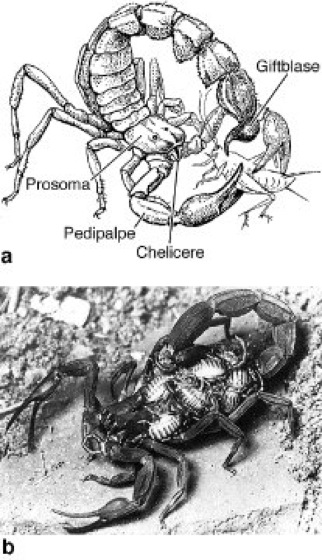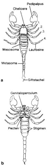 Abb. 1: Bauplan der Skorpione in a Dorsal-, b Ventralansicht