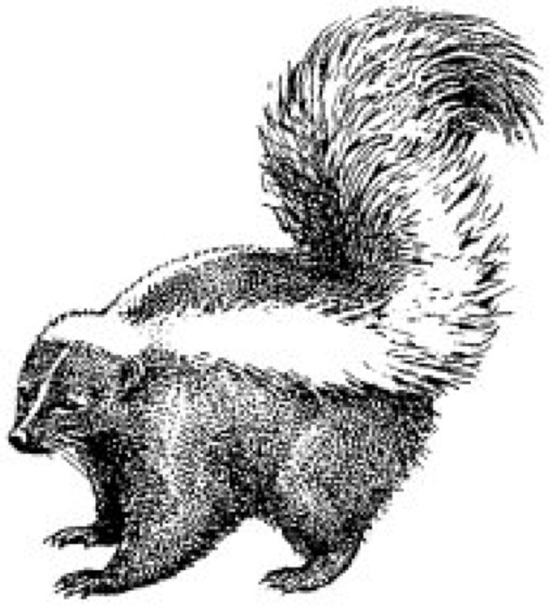 Skunks [engl., aus Algonkin-Sprache], Skunke, Stinktiere, Mephitinae, neuweltliche Unterfamilie der Marder. Ihr Körper wirkt plump und stämmig (Kopfrumpflänge 25–45 cm; bis 40 cm langer, buschiger Schwanz; vgl. Abb. ). Das Fell ist langhaarig, meist schwarz mit weißen Streifen oder Flecken. Man unterscheidet 3 Gattungen ( vgl. Tab. ) mit insgesamt 9 Arten. Als Lebensraum bevorzugen Skunks Buschwald und Grasland; sie meiden dichte Wälder. Ihre Ernährung ist vielseitig (omnivor). Skunks bespritzen Gegner aus dem „Handstand“ gezielt mit einem übelriechenden Abwehrsekret ihrer Analdrüsen („Stinkdrüsen“; daher die Bezeichnung „Stinktiere“). Der intensive Geruch stammt hauptsächlich von Mercaptanen (schwefelhaltigen Alkohol-Analoga). Zur Pelzverarbeitung gelangen vor allem Felle kanadischer und nordamerikanischer Skunks. Nordamerika I .