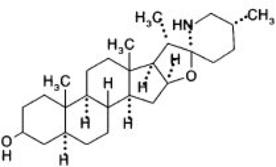 Soladulcidins, Steroidalkaloid ( vgl. Abb. ) aus Solanum dulcamara, dem Bittersüßen Nachtschatten; liegt in der Pflanze glykosidisch gebunden (Soladulcidintetraosid) vor.