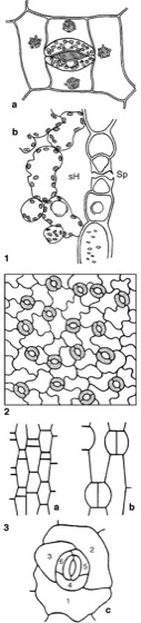 1a Flächenansicht und b Querschnitt der Epidermis der Blattunterseite von Tradescantia; sH substomatärer Hohlraum (früher „Atemhöhle“ genannt), Sp Spalt der Spaltöffnung. 2 Regelmäßiges Spaltöffnungsmuster in der unteren Epidermis des Blatts der Christrose (Helleborus niger). 3Entwicklung von Spaltöffnungen: Im einfachsten Fall, z.B. bei vielen Einkeimblättrigen (Monokotylen), entstehen Spaltöffnungen nach inäqualer Teilung einer Epidermiszelle aus der kleineren Zelle (Spaltöffnungsmutterzelle) nach Längsteilung (a, b). Bei den meisten Zweikeimblättrigen (Dikotylen) weisen die Spaltöffnungen jedoch mehrere Nebenzellen auf, die sich durch eine Folge inäqualer Teilungen in verschiedenen Richtungen bilden (c). In der Abb. sind die Nebenzellen in der Reihenfolge ihrer Entstehung (1–6) beziffert. Die 7. Teilung ist eine äquale Teilung, bei der die Schließzellen entstehen.