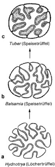 Abb. 2: Beispiel einer Entwicklungslinie vom „offenen“ Trüffel-Fruchtkörper (a) zu der „geschlossenen“ Knolle (c) der Tuber-Arten