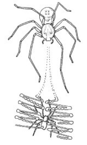 Speispinnen, Sicariidae, Familie der Webspinnen mit ca. 180 Arten in tropischen und subtropischen Gebieten (eine Ausnahme: Scytodes thoracica, kosmopolitisch). Speispinnen haben nur 3 Augenpaare. Ihre Giftdrüse ist in einen großen leimproduzierenden und einen kleinen giftproduzierenden Teil untergliedert. Sobald die Beute geortet ist, wird sie mit 2 aus den Cheliceren geschleuderten Leimfäden an die Unterlage gefesselt. Die Vertreter der Gattung Sicarius (Südafrika, Südamerika) erreichen 3 cm Körperlänge. Sie leben unter Steinen oder in selbstgegrabenen Höhlen und können bei Bedrohung laut stridulieren (Pedipalpen/Cheliceren). Die Arten der Gattung Loxosceles leben in allen warmen Ländern (Ausnahme Australien) unter Rinde und Steinen, wo sie große Gespinstdecken anlegen. Loxosceles reclusa („Brown Spider“) in Amerika muß zu den auch für den Menschen gefährlichen Spinnen gerechnet werden. Einzige in Mitteleuropa vorkommende Art ist Scytodes thoracica, die dort jedoch fast ausschließlich in Gebäuden lebt. Die 4–5 mm große, nachtaktive, hellgelb/braun gemusterte Spinne macht ohne Netz Jagd auf Beute ( vgl. Abb. ): aus 1–2 cm Entfernung spritzt sie das Leimsekret über das Opfer (in 1/600 s), tötet es mit Giftbiß und saugt es aus. Die Spinndrüsen sind nur schwach entwickelt. Ihr Sekret dient dazu, lockere Wohngespinste und eine dünne Gewebsschicht über den mit Cheliceren und Pedipalpen getragenen Eiballen zu spinnen. Haplogynae.