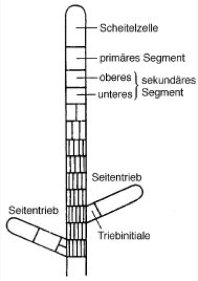 Scheitelzelle von Sphacelaria: Die Spitzenzelle des Sphacelaria-Thallus ist eine einschneidige Scheitelzelle. Die von ihr abgegliederten Segmente können sich in die beiden anderen Raumebenen weiter teilen. Es kommt so zur Ausbildung eines mehrschichtigen echten Gewebethallus.