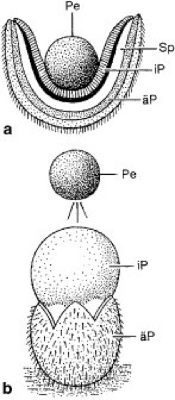a Querschnitt durch einen abschußbereiten Fruchtkörper (Größe 1–3 mm); b Abschuß der Peridiole. äP äußere Peridie (Exoperidie), iP innere Peridie (Endoperidie), Pe Peridiole (Gleba), Sp Spalt