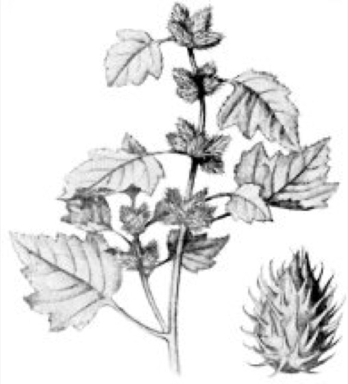 Gewöhnliche Spitzklette (Xanthium strumarium), rechts unten Frucht