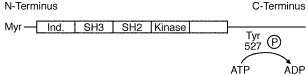 Domänenstruktur der normalen src-Proteine. N-terminal: Myristinsäure; Ind.: individueller Abschnitt; SH3 und SH2: Bindedomänen für prolinreiche Motive bzw. phosphorylierte Tyrosinreste; Kinase: hochkonservierte Kinase-Domäne.