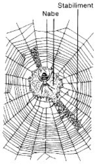 Stabilimente [von latein. stabilimentum = Befestigung], auffallende, verschieden (oft zickzackförmig) gestaltete und angeordnete Gespinste innerhalb der Radnetze mancher Radnetzspinnen (früher wohl fälschlich als netzstabilisierende Strukturen angesehen). Ihre Bedeutung ist bis heute nicht eindeutig geklärt, wobei Tarnung, Lockwirkung für Beute und Sichtbarkeit für Vögel diskutiert werden. Stabilimente ( vgl. Abb. ) treten nur bei Arten auf, die sich normalerweise in der Nabe des Spinnennetzes aufhalten, z.B. häufig bei Arten der Gattung Argiope, auch bei der einheimischen Wespenspinne (Argiope bruennichi).