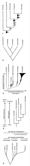 Auseinanderentwicklung) an. – Ein Kladogramm ist ein Stammbaum der Kladistik (phylogenetische Systematik). Es zeigt die Aufspaltungen (Cladogenese) besonders deutlich (Archicoelomatentheorie [Abb.], Chelicerata [Abb.], Insekten [Abb.]) und kann durch Angabe der Synapomorphien auch die wesentlichen Argumente vorstellen (Abb. 1). Es wird keine Angabe über den absoluten Zeitpunkt der Aufspaltungen gemacht, jedoch über deren relative Abfolge. Da die Abszisse dimensionslos ist, können die „Stammbaumgabeln“ um die Verzweigungspunkte gedreht werden: Abb. 1 und 2 sind in ihrer kladistischen Aussage identisch! – Genau so wie Kladogramme sehen Phänogramme aus (Archaebakterien [Abb.], Purpurbakterien [Abb.]), die der numerischen Taxonomie entstammen und auf Gesamtähnlichkeit beruhen, also auch Symplesiomorphien (Plesiomorphie) berücksichtigen. Phänogramme sind daher nicht immer ein Abbild der Cladogenese. – In der Paläontologie zeigen unterschiedlich dicke Stammbaum-Linien (Abb. 3) den jeweiligen Umfang als Zahl der fossilen Taxa je Zeiteinheit an. – Die Organisationshöhe (![]()