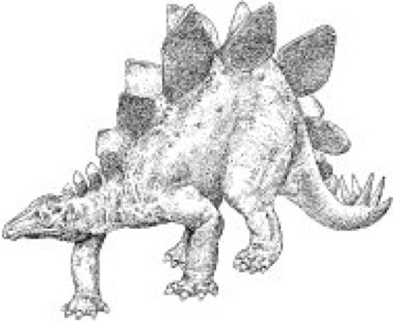 Stegosauria [von *stego- , griech. sauros = Echse], (Marsh 1877), Stegosaurier, Stacheldinosaurier, mit Panzerplatten ausgestattete Dinosaurier, sekundär quadrupede, zu den Ornithischia gehörende herbivore Dinosaurier (Farbtafel) aus der Gruppe Ornithopoda; auf dem Hals, Rücken und bis zum Schwanz mit 2 Reihen senkrecht stehender, alternierend angeordneter, dreieckiger Hautknochen oder knöcherner Stacheln, die nahe dem Schwanzende in 2 Stachelpaare übergehen. Die Platten oder Dornen sind stark vaskularisiert, waren also von Blutgefäßen durchzogen, weshalb sie als der Temperaturregulation dienend gedeutet werden. Möglicherweise waren sie zusätzlich Imponiergebilde. Bei einer Körperlänge bis 8 m war der lange, schmale Schädel sehr klein. Das Gehirn des etwa 7 m langen Stegosaurus ( vgl. Abb. ) aus dem oberen Jura von Nordamerika hatte nur die Größe einer Walnuß. Die 5fingerige Hand und der 4zehige Fuß trugen Hufe. Vorkommen: vom unteren Jura bis zur oberen Kreide von Europa, Nordamerika, Süd- und Ostafrika sowie Ostasien (China).