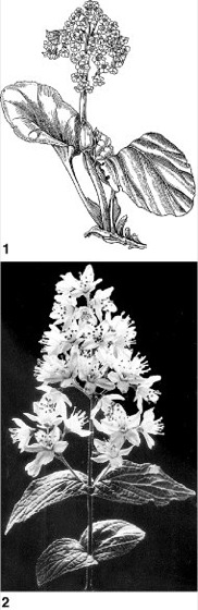 1 Bergenie (Bergenia spec.),2 Deutzie (Deutzia spec.)