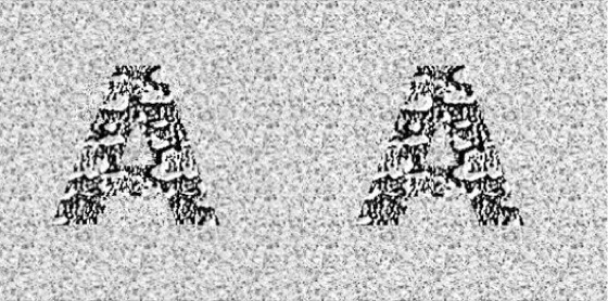 Random-Dot-Stereogramm: Bei Betrachten der beiden Bilder mit auf unendlich fokussierten Augen oder mit einer Stereobrille sieht man eine „2“ vor den „verschmolzenen“ Buchstaben A stehen.