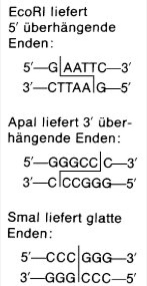 Restriktionsenzyme können unterschiedlich überhängende oder glatte Enden durch den Schnitt eines DNA-Doppelstrangs generieren.
