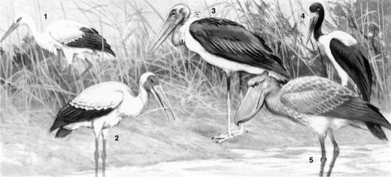 1 Weißstorch (Ciconia ciconia),2 Afrika-Nimmersatt (Mycteria ibis, früher Ibis ibis),3 Afrika-Marabu (Leptoptilos crumeniferus),4 Afrika-Sattelstorch (Ephippiorhynchus senegalensis, größter Storch: Höhe ca. 1,3 m, Spannweite etwa 2,4 m), 5 Schuhschnabel (Balaeniceps rex)