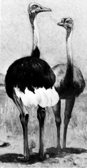 Strauße, Struthioniformes, Ordnung der Vögel mit 1 Familie (Struthionidae) und heute nur noch 1 Art, dem Strauß (Struthio camelus; ß vgl. Abb. und Afrika II ); flugunfähig, stammt von flugfähigen Vorfahren ab, ebenso wie die übrigen Laufvögel (Nandus, Kasuarvögel und Kiwivögel). Mit einer Gesamthöhe bis 3 m und einem Gewicht von 150 kg ist der (männliche) Strauß der größte heute lebende Vogel. Er bewohnt weitläufige Savannenlandschaften in Südwest-Afrika, meist in denselben Gebieten wie Zebras und Antilopen. Das Gefieder des Männchens ist schwarz und weiß, das des Weibchens braun und weiß gefärbt. Die Flügel sind zwar normal ausgebildet, sie können den Vogel aber seines Gewichts wegen nicht tragen. Die Schmuckfedern an den kurzen Flügeln werden von den Männchen während der Balz zur Schau gestellt. Die Beinmuskulatur ist ausgesprochen kräftig entwickelt. Beim Laufen erreichen die Vögel hohe Geschwindigkeiten (bis 70 km/h). Die Schlüsselbeine fehlen, und der Fuß hat nur eine 3. und 4. Zehe. Die Nahrung besteht aus Insekten, kleinen Wirbeltieren und Körnern; oft bilden Sukkulenten die bevorzugte Nahrung. Der kräftige Muskelmagen enthält viele Steine zum Zerreiben der harten Nahrung. Strauße leben meist polygam. Mehrere Weibchen legen jeweils 6–8 cremeweiße, sehr hartschalige Eier in die gemeinsame, von Männchen ausgescharrte Nestmulde. Diese Rieseneier (Gewicht 1,4 kg) werden von beiden Geschlechtern 6 Wochen lang bebrütet. Die frischgeschlüpften Jungen tragen einen hellbraunen Flaum und sind Nestflüchter. Sie werden vom Hahn und der Haupthenne mehrere Monate in Obhut genommen; danach schließen sich verschiedene Familien zusammen. So entstehen Herden, die aus mehreren Hundert Vögeln bestehen können. Der familieninterne Kontakt bleibt jedoch nach wie vor bestehen. In jüngerer Zeit wird der Strauß zunehmend wieder als Nutzgeflügel gehalten, wobei die vergangene Federmode keine Rolle spielt. Auch in Deutschland gibt es Straußenfarmen, die vor allem der Fleischgewinnung dienen. Aussterben II , Balz II , Brutpflege .