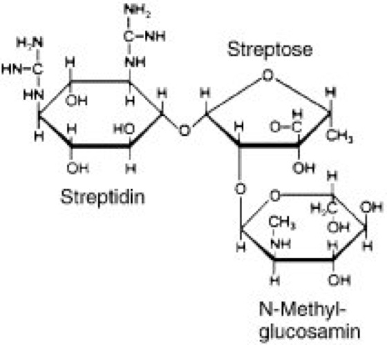 Streptomycins, von Streptomyces-Arten (Streptomycetaceae), z.B. Streptomyces griseus, gebildetes Aminoglucosid-Antibiotikum (Antibiotika), das aus den 3 glykosidisch miteinander verknüpften Zuckern Streptidin, Streptose und N-Methylglucosamin aufgebaut ist ( vgl. Abb. ). Streptomycin wirkt bakterizid und tuberkulostatisch und ist vor allem gegen gramnegative Bakterien sowie Kokken und Mykobakterien gerichtet. Der molekulare Wirkungsmechanismus des Streptomycins beruht auf einer Bindung des Streptomycins an das Protein S12 der 30S-Untereinheit der prokaryotischen Ribosomen, wodurch ein fehlerhaftes Ablesen der mRNA während der bakteriellen Proteinbiosynthese verursacht wird (Antibiotika [Abb.]). Die therapeutische Anwendung von Streptomycin ist aufgrund erheblicher Nebenwirkungen sowie der hohen Zahl resistenter Stämme stark eingeschränkt. Streptomycin wird hauptsächlich gegen Tuberkulose verwendet (Antituberkulotika). Ambiguität, Folkers (K.A.), Waksman (S.A.).