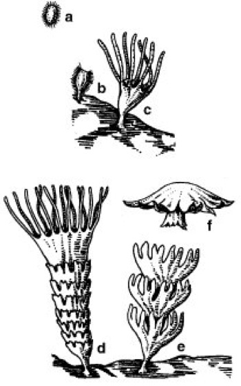 Die Abb. zeigt den Entwicklungszyklus eines Vertreters der Scyphozoa (Echte Quallen): a freischwimmende Larve; b, c Larve setzt sich fest und wächst zu einem Polypen heran; d Strobilation; e, f Abtrennen junger Medusen, die zu geschlechtsreifen Medusen heranwachsen.