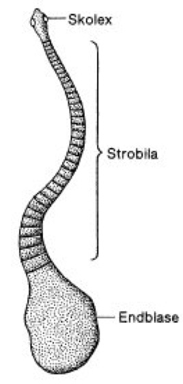 Strobilocercusm [von *strobilo- , griech. kerkos = Schwanz], 2. Larvenstadium bei bestimmten Bandwürmern, z.B. Hydatigera taenioformis (Taeniidae), besteht aus Skolex, kurzer Strobila und Endblase ( vgl. Abb. ).