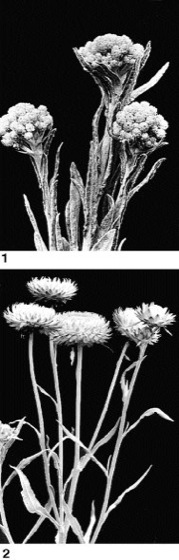 1 Sand-Strohblume (Helichrysum arenarium), 2 Garten-Strohblume (Helichrysum bracteatum)