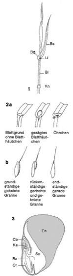 1 Morphologie eines „Grashalms“. 2 Verschiedene Ausbildungsformen a des Blattgrunds und b der Deckspelzen, 3 Aufbau der Karyopse vom Mais (Zea mays).