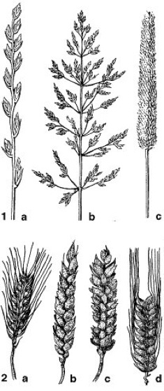 1 Nach der Gestalt des Blütenstands unterscheidet man 3 Hauptgruppen von Gräsern: die aÄhrengräser (Ähre oder Traube), bRispengräser (Rispe) und cÄhrenrispengräser (Rispe mit stark verkürzten Rispenästen). 2 Beispiele für Getreide: a Roggen (Secale cereale),b Dinkel oder Spelz (Triticum spelta),c Saatweizen (Triticum aestivum),d Gerste (Hordeum vulgare)