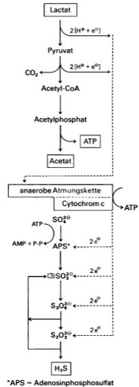 Sulfatatmung, Desulfurikation, dissimilatorische Sulfatreduktion, bakterieller anaerober Energiestoffwechsel, in dem organische Substrate oder Wasserstoff oxidiert und Sulfat (SO42–) zu Schwefelwasserstoff (H2S) reduziert werden ( vgl. Abb. ). Sulfate und andere oxidierte Schwefelverbindungen dienen an Stelle von molekularem Sauerstoff als Elektronenakzeptoren. Die Sulfatreduktion ist ein sehr komplexer Vorgang, bei dem anfangs sogar Energie (ATP; Adenosintriphosphat) zur Aktivierung von Sulfat verbraucht wird. Der Energiegewinn erfolgt an einer Elektronentransportkette (oxidative Phosphorylierung), die Cytochrome (c und b) als Komponenten enthält. Da dieser Stoffwechselweg unter anaeroben Bedingungen abläuft, kann er auch als „Schwefelwasserstoffgärung“ bezeichnet werden. Bakterien mit einer Sulfatatmung werden Sulfatreduzierer (Desulfurikanten) genannt. Eine besondere Form des Energiegewinns findet man bei einigen Sulfatreduzierern, die Schwefelkomponenten disproportionieren (Schwefel-Disproportionierung). Desulfovibrio sulfodismutans kann z.B. Thiosulfat zu Sulfat und Schwefelwasserstoff umwandeln; dabei entsteht ein Protonen-Gradient (protonenmotorische Kraft), der zum ATP-Gewinn genutzt wird. – Sulfatatmung findet in anaeroben Habitaten statt, wo organisches Material zersetzt wird und Sulfat vorliegt, z.B. Faulschlamm und Meeresablagerungen. Die schwarze Färbung des Faulschlamms (Sapropel) entsteht durch Ausfällung von Eisen oder anderen Schwermetallen mit H2S zu den entsprechenden Sulfiden. Die Hauptmenge des H2S in der Natur stammt aus der Sulfatatmung. Die meisten Schwefelablagerungen an der Golfküste von Texas und Louisiana sind biologischen Ursprungs und unter Beteiligung von Sulfatreduzierern entstanden. Desulfuration, Mineralisation, Schwefelkreislauf.