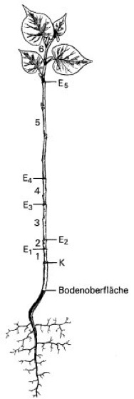 Die Entstehung des Sympodiums läßt sich besonders an jungen Sprossen bzw. Zweigen rekonstruieren. Die Endknospe eines jeden Jahrestriebs stirbt ab (E1–E5). Beim Austrieb im Frühjahr bildet die oberste Seitenknospe den Fortsetzungstrieb, der sich genau in die Richtung des früheren Hauptsprosses einstellt. Dies wiederholt sich immer wieder, so daß die scheinbare Hauptachse, das Sympodium, in Wirklichkeit aus jährlich aufeinanderfolgenden Seitenachsen (2–6) besteht. Diese Verzweigungsart gilt auch für die aus tieferliegenden Achselknospen entstehenden Seitenzweige. K = Keimblattnarben.