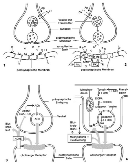 1 Schematische Darstellung des Wirkungsmechanismus bei direkt wirkenden Neurotransmittern: Transmitter binden an den Rezeptoren der postsynaptischen Membran und bewirken die Öffnung von Ionenkanälen, die den Einstrom u.a. von Na+-, K+- und Cl–-Ionen aus dem extrazellulären Raum in die nachgeschaltete Zelle (z.B. Nerven-, Drüsen-, Muskelzelle) ermöglichen. 2 Stark vereinfachte Darstellung des Wirkungsmechanismus bei indirekt wirkenden Neurotransmittern: 1) Transmitter bindet an Rezeptor; 2) Adenylat-Cyclase synthetisiert aus ATP den sekundären Boten cyclo-AMP; 3) cyclo-AMP aktiviert Proteinkinase; 4) Phosphodiesterase baut cyclo-AMP wieder ab; 5) aktive Proteinkinase phosphoryliert Membranprotein; 6) phosphoryliertes Membranprotein öffnet Ionenkanäle. – AC Adenylat-Cyclase, Ap Aktionspotential, ATP Adenosintriphosphat, Ca2+ Calciumionen, cAMP cyclo-AMP (zyklisches Adenosinmonophosphat), Ig Ionenkanäle geschlossen, Io Ionenkanäle offen, Mp Membranprotein, Pi anorganisches Phosphat, PDE Phosphodiesterase, PKa Proteinkinase aktiv, PKi Proteinkinase inaktiv, R Rezeptor, T Transmitter.