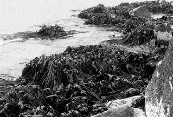 Tangwälder, dichte Bestände sehr großwüchsiger Braunalgen im Sublitoral oder auch direkt an einer Felsküste im Gezeitenbereich (Gezeiten) kühler und kalter Meere ( ä vgl. Abb. ). Die meist aus Riesentangen (bis über 40 m lang) der Arten Macrocystis und Nereocystis (Laminariales, Kelp) bestehenden, am Meeresboden verankerten Tangwälder mit auf dem Wasser ausgebreitet schwimmenden Blattorganen (Auftrieb durch gasgefüllte blasenartige Organe; Aerocyste) sind ein geschützter Lebensraum zahlreicher Robben, Seelöwen, Seeotter, Fische, Muscheln oder Krebse, werden aber auch vom Menschen geerntet (Meereswirtschaft) und zu Alginaten (Alginsäure) verarbeitet und sind schon von daher gefährdet. Ihre Vorkommen liegen an den Kaltwasserküsten beider Erdhemisphären, so von Alaska bis Südkalifornien, um Feuerland, oder an den südatlantischen Inseln bis Neuseeland. Auf der Südhalbkugel treten dazu bis über 30 kg schwere und viele Meter lange Riesentange des Fels-Litorals wie Durvillaea (in der Abb. Durvillaea antarctica an der Felsküste der Südinsel Neuseelands) oder Carpophyllum, die einen wirksamen natürlichen Brandungsschutz abgeben können. An den west- und nordeuropäischen Küsten sind die Braunalgen nur maximal wenige Meter lang, oft kleiner, bilden aber ebenfalls dichte Teppiche und Bestände im Eu- und Sublitoral (Laminaria, Fucus, Himanthalia [Fucales]).