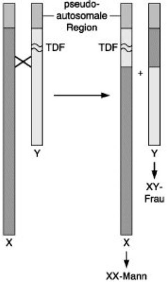 Der abnormale Austausch von DNA-Sequenzen der nichthomologen Bereiche von X- und Y-Chromosomen kann zur Entstehung von XX-Männern und XY-Frauen führen, wenn der TDF hierbei mit betroffen ist. Dieser Austausch kann z.B. dadurch hervorgerufen werden, daß sich in der pseudoautosomalen Region stattfindende obligatorische Crossing over bis in den X- bzw. Y-Chromosomen spezifischen Teil ausweiten und schließlich auch nicht-homologe Chromosomenstücke ausgetauscht werden. Die abnormale X-Y-Rekombination, die während der väterlichen Meiose stattfindet, ist normalerweise unterdrückt. Es entstehen X-Chromosomen mit TDF, die zur Entwicklung von XX-Männern führen, und Y-Chromosomen ohne TDF, die zur Entwicklung von XY-Frauen führen. Die Analyse dieser Individuen erbrachte wesentliche Fortschritte bei der Suche nach dem TDF.