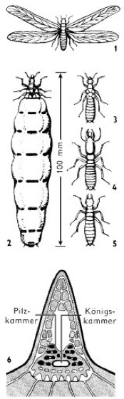 Termiten [von Termitidae], Isoptera, Ordnung der Insekten mit ca. 2000 meist tropischen Arten in 6 Familien ( vgl. Tab. ), nur 2 Arten im Süden Europas. Die Termiten sind staatenbildende Insekten. (Termitenstaaten haben unter den staatenbildenden Tieren die höchste Individuenzahl – bis zu 3 Millionen bei Macrotermes natalensis.) Sie sind nicht mit den Ameisen (falscher Name: „Weiße Ameisen“), sondern mit den Schaben verwandt. Abgeleitete Merkmale der Termiten sind u.a. Eusozialität mit Geschlechtstieren (Königin und König), Soldaten und ArbeiterInnen aus beiden Geschlechtern; Flügel mit basalen Soll-Bruchstellen zum Abwerfen; externe Genitalien rudimentär oder reduziert. Der Körperbau der Termiten variiert je nach Art und Kaste erheblich. Die Größe reicht von ca. 10 mm bis ca. 12 cm (Königin der Art Odontotermes fidens). Die Königinnen der Art Macrotermes natalensis können bei prall mit Eiern gefülltem Abdomen bis 14 cm lang werden. Der meist schlanke, blaß gefärbte, schwach sklerotisierte Körper ist immer deutlich in Kopf, Brustabschnitt und Hinterleib gegliedert. Der überwiegend frei bewegliche, rund bis oval gebaute und flach gewölbte Kopf trägt ein Paar Komplexaugen, die nur bei den Geschlechtstieren vollständig ausgebildet sind. Die Arbeiter ( vgl. Abb. ) sind häufig blind. Die 14- bis 34gliedrigen, perlschnurartigen Fühler stellen die wichtigsten Orientierungs- und Kommunikationshilfen dar. Die schon bei den Arbeiterinnen und Geschlechtstieren kräftig gebauten, beißend-kauenden Mundwerkzeuge sind bei der Kaste der großköpfigen Soldaten ( vgl. Abb. ) erheblich vergrößert und stellen gegen Angreifer des Nestes eine gefährliche Waffe dar. Je nach Art kommen verschiedene Morphen dieser Soldaten vor: Bei den Kiefersoldaten sind die häufig unsymmetrischen Oberkiefer (Mandibeln) vergrößert und mit kräftiger Muskulatur ausgestattet. Die Soldaten der Nasentermiten (Familie Rhinotermitidae) werden wegen eines aus den Unterlippen gebildeten gegabelten Fortsatzes Gabelnasuti genannt. Alle Soldaten können sich zudem mit dem klebrigen, oft giftigen Sekret einer Stirndrüse (Wehrdrüse; Frontaldrüse) verteidigen, die bei den Nasensoldaten (Nasuti) der Gattung Nasutitermes (Familie Termitidae) besonders gut ausgebildet ist. Von den 3 etwa gleich großen Brustabschnitten ist bei den Termiten meist der vordere gut beweglich. Jedes Segment trägt je 1 Beinpaar; Flügel haben nur die Geschlechtstiere in der Schwärmphase. Deutlich sind die 10 Segmente des breit am Brustabschnitt ansetzenden Hinterleibs unterscheidbar. Das 10. Segment trägt ein Paar Cerci. Die Geschlechtsöffnungen befinden sich zwischen dem 9. und 10. (Männchen) bzw. 7. und 8. (Weibchen) Hinterleibssegment. – Die Zugehörigkeit zu den verschiedenen Kasten wird bei den Termiten wahrscheinlich nicht genetisch bestimmt, sondern zumindest zum Teil durch Pheromone. Die meist blaß gefärbten Arbeiter können sowohl männlichen als auch weiblichen Geschlechts sein; stets sind die Geschlechtsorgane verkümmert. Ihnen obliegen im Termitenstaat alle Arbeiten außer der Verteidigung und der Fortpflanzung, so auch die Ernährung der übrigen Kasten und der Brut. Bei manchen Arten fehlen die Arbeiter; ihre Aufgaben werden dann von Altlarven verrichtet, die das Imaginalstadium nicht erreichen (Scheinarbeiter, Pseudergaten). Die Nahrung der Termiten besteht meist aus cellulosehaltigen pflanzlichen, auch sich zersetzenden Stoffen, bei primitiveren Arten ausschließlich aus Holz; die Arten der Familie Termitidae sind Allesfresser. Die Cellulose wird mit Hilfe von endosymbiontischen Bakterien (nur Familie Termitidae) und Flagellaten (alle übrigen Termiten) in einem Teil des Darms aufgeschlossen ( Endosymbiose ). Einige Arten der Termiten züchten in speziellen Kammern ihrer Nester Pilze als Nahrung (Termitenpilze, Pilzgärten). Die in Form und Größe sehr verschiedenartig gebauten Nester ( vgl. Abb. ) werden je nach Art in Bäumen, in Holz oder im Boden angelegt. Baumaterialien sind Erde, zerkleinertes pflanzliches Material, Papier und ähnliches, auch in Kombination, häufig mit Speichel oder Kot verstärkt. Fast das gesamte Leben der feuchtigkeitsliebenden Termiten spielt sich innerhalb des meist kompliziert gekammerten, auch unterirdisch mit Gängen und Galerien versehenen Nestes ab, das durch Luftschächte, Isolierungen und ähnliche Konstruktionen perfekt klimatisiert ist. Im Gegensatz zu den sog. nicht-konzentrierten Nestern der primitiveren Familien der Termiten ist der Aufbau der sog. konzentrierten Nester höher organisiert: In einer zentral gelegenen Kammer ist die über 10 Jahre alt werdende Königin eingemauert, in daran anschließenden Schichten folgen die Kammern für Eier und junge Larven (Brutschicht), darauf nach außen die Wohnschicht mit Kammern für die älteren Larven und die Geschlechtstiere. Die Nester erreichen Höhen von mehreren Metern. Die Kompaßtermite (Amitermes meridionalis) legt die Giebelseiten ihres schmalen, hausähnlichen, bis zu 5 m hohen Bauwerks stets in Nord-Süd-Richtung an, um eine starke Aufheizung durch die Sonne zu vermeiden. Die Kommunikation und Erkennung zwischen Mitgliedern eines Staates erfolgen durch taktile Reize und durch Duftstoffe; z.B. wirkt Limonen als Alarmstoff. Der Gründung eines neuen Termitenstaats geht die Schwärmphase der Geschlechtstiere (Hochzeitsflug) aus dem alten Nest voraus. Erst wenn ein Paar einen geeigneten Platz für ein Nest gefunden hat, erfolgt die Begattung. Innerhalb ihres bis zu 10 Jahre dauernden Lebens kann eine Königin ( vgl. Abb. ), das fertile Weibchen, mehrere Millionen Eier ablegen; sie wird dabei mehrmals vom König ( vgl. Abb. ), dem einzigen fertilen Männchen, begattet. Die Larven entwickeln sich hemimetabol in 200–400 Tagen zu den Imagines. – Die Bedeutung der Termiten konzentriert sich auf die Schadwirkung durch die Zerstörung von Holz an Bauwerken und den Fraßschaden an vielen Kulturpflanzen, wie Citru