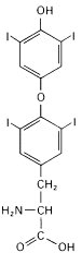 Thyroxins [von *thyro- , griech. oxys = sauer], 3,3',5,5'-Tetraiodthyronin, Abk. T4, aus 2 Tyrosin-Resten (3,5-Diiodtyrosin, Tyrosin; vgl. Abb. ) zusammengesetztes Hormon der Schilddrüse (Schilddrüsenhormone), das, an Thyreoglobulin gebunden, in deren Follikeln lokalisiert ist und unter dem Einfluß von Thyreotropin nach Proteolyse an das Blut abgegeben wird, wo es erneut proteingebunden (thyroxinbindende Globuline, Präalbumine und Albumine; Transthyretin) transportiert wird. Die Plasmakonzentration des Thyroxins beim Menschen beträgt etwa 100 μg/l, wovon 99,97% proteingebunden, also biologisch nicht wirksam, vorliegen. Die – in der Regel langfristige – Wirkung des Thyroxins (wobei die etwa um den Faktor 10 aktivere Form die des um 1 Iod-Atom ärmeren Triiodthyronins ist, etwa 35% des Thyroxins wird im Körper in Triiodthyronin umgewandelt) ist außerordentlich vielseitig und besteht in einer generellen Aktivierung des Kohlenhydratstoffwechsel, Fettstoffwechsels und Proteinstoffwechsels und damit Stimulation des Sauerstoffverbrauchs und der Wärmeproduktion (Erhöhung des Grundumsatzes; Stoffwechselintensität, Temperaturregulation). Über die Stimulierung des Proteinstoffwechsels fördert es Wachstums- und Entwicklungsprozesse (anaboles Hormon; anabole Wirkung), wobei hierfür auch die Gegenwart von Somatotropin notwendig ist. Ein Mangel oder das Fehlen von Thyroxin oder Iod während der Embryonalentwicklung führt zu Idiotie und Kretinismus und beim Erwachsenen zur Kropfbildung (Kropf) und Hypothyreose, vermehrte Produktion im erwachsenen Körper zur Basedowschen Krankheit (Hyperthyreose). Große Bedeutung kommt dem Thyroxin auch bei der Steuerung der Metamorphose der Amphibien (Axolotl) zu und beim Auslösen von Häutungs- (Häutung) und Mauservorgängen (Mauser) bei Reptilien bzw. Vögeln. Der molekulare Wirkmechanismus besteht ähnlich dem der Steroidhormone (Hormone [Abb.]) in einer Enzym-Induktion im Zellkern. Thyroxin-Rezeptorproteine im Cytosol konnten nachgewiesen werden, daneben unterstützt Thyroxin die Wirkung der Catecholamine und des Somatotropins auf die Lipolyse (permissive Wirkung). – Nach Desaminierung, Decarboxylierung und Deiodierung wird Thyroxin über die Niere und mit dem Kot ausgeschieden (Plasmahalbwertszeit etwa 7 Tage). Über die Galle ausgeschiedene Glucuronsäurekonjugate (Glucuronsäure) können im Darm wieder gespalten und über einen enterohepatischen Kreislauf (Gallensäuren) zurückgewonnen werden. Altern, Atmungskette, Kendall (E.C.), Levothyroxin, Neotenie.