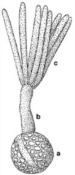 Gekeimte Brandspore; a Brandspore (Probasidie), b Basidie (Promycel), c Basidiosporen (primäre Sporidien)