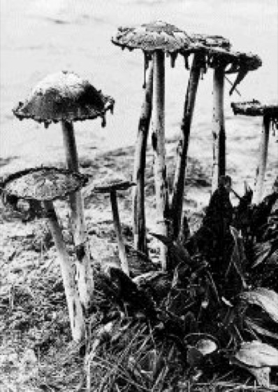 Tintling (Coprinus spec.). An der Unterseite des Huts erkennt man schwarze, abtropfende Lamellen mit Sporen.