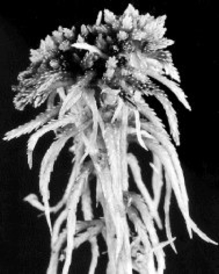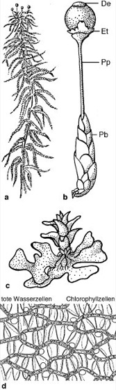 Abb. 2: a Habitus von Sphagnum acutifolium;b reifes Sporogon am Ende eines Zweigs von Sphagnum squarrosum (Pb Perichaetialblätter, Pp Pseudopodium, Et Embryotheka, De Deckel); c Protonema mit jungen Pflänzchen von Sphagnum acutifolium. d Ausschnitt eines einschichtigen Blatts von Sphagnum acutifolium: zwischen den großen, toten Wasserzellen mit Ringverdickungen und Löchern (im trockenen Zustand mit Luft, im feuchten Zustand mit Wasser gefüllt) befinden sich schmale Chlorophyllzellen.