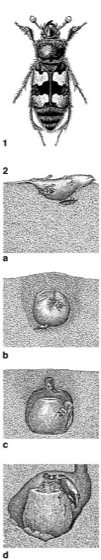 1Nicrophorus vespillo. 2a Zwei Totengräber (Nicrophorus vespillo) versenken langsam ein Aas in die Erde; b dann formen sie aus dem Aas eine Kugel, indem sie dieses einspeicheln und die Haare abbeißen; c anschließend wird eine Krypta um die Nahrungskugel gepreßt und im Aas ein Trichter angelegt, in den später die 8–12 Larven hineinwandern; d das Muttertier füttert die im Krater sitzenden Larven.