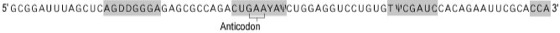 Abb. 3: Lineare Nucleotidsequenz eines tRNA-Moleküls. Die Lage von DHU-Arm, Anticodon-Arm, TψC-Arm und dem CCA-Ende, an dem die Aminoacylierung erfolgt, sind von links nach rechts (5'-3'-Richtung) hervorgehoben.