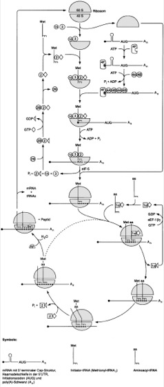 Schematische Darstellung des Ablaufs der Translation in Eukaryoten. Die beteiligten Faktoren (Elongations-, Initiations- bzw. Releasing-Faktoren) sind als Kreise, Vierecke oder andere Figuren mit den entsprechenden Zahlen bzw. Zahlen-Buchstaben-Kombinationen angegeben. Die wichtigsten Angriffspunkte der Translationskontrolle über Phosphorylierung von Initiationsfaktoren sind eIF-2, der an der Bildung des sog. Ternärkomplexes (aus Methionyl-tRNA, eIF-2 und GTP) und dessen Bindung an die 40S-Untereinheit beteiligt ist (linke obere Bildhälfte), und eIF-4F, der die Erkennung der Cap-Struktur und die Bindung gecappter mRNA an die 40S-Untereinheit vermittelt (rechte obere Bildhälfte).