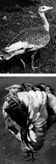 Großtrappe (Otis tarda), oben Henne, unten Hahn während der Balz