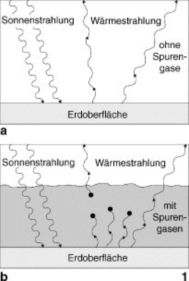 1 Schematische Darstellung der Wirkung im Infraroten absorbierender Spurenstoffe auf den Strahlungshaushalt des Systems Erde/Atmosphäre.