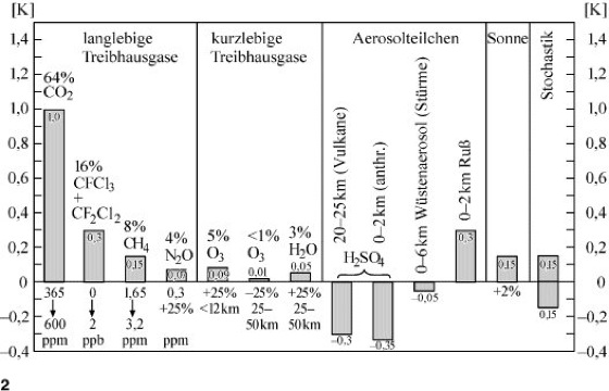 2 Zu erwartende Änderungen der globalen, bodennahen Jahresmitteltemperaturen (nach vereinfachten Klimamodellabschätzungen) als Folge einer Verdopplung der klimawirksamen Spurengase, der atmosphärischen Aerosolteilchen, solarer Aktivitätsschwankungen und zufallsbedingter Klimafluktuationen.
