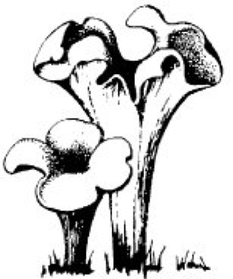 Trompeten, Kraterellen, Craterellus, Gattung der Leistenpilze, in Europa mit 2 Arten. Häufig, oft massenhaft auftretend, findet man die Herbsttrompete oder Totentrompete (Craterellus cornucopioides Pers.; vgl. Abb. ) auf guten, nährstoffreichen Böden im Laubwald, besonders bei Buche, Eiche und im Mischwald. Der Fruchtkörper ist lang trichterförmig, oben umgeschlagen (Höhe: 5–12[15] cm), innen feinschuppig braunschwarz, außen aschgrau. Der Hymenophor an der Unterseite (= Außenseite) ist glatt oder schwach runzelig. Sehr guter Speisepilz, besonders zum Trocknen geeignet. Die ebenfalls eßbaren Grauen Leistlinge (Craterellus cinereus Pers.) wachsen oft in der Nähe der Herbsttrompeten, denen sie im Aussehen sehr ähnlich sind. Sie bleiben aber etwas kleiner und besitzen an der Außenseite deutlich ausgebildete Pfifferlingsleisten.
