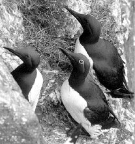 Trottellummew, Uria aalge, ca. 42 cm großer Alken-Vogel (Alken) der mittel- und nordeuropäischen Atlantik- und Ostseeküsten; häufigste Art; schwarz-weiß, langer gerader Schnabel ( vgl. Abb. und Europa I ). Eine im Norden häufige Variante, die „Ringellumme“, hat einen weißen Augenring und eine vom Auge nach hinten verlaufende weiße Linie. Die Trottellumme brütet an steilen Felsklippen (Felsbrüter) mit Vorsprüngen und schmalen Felsbändern. Das Ei ist dank seiner stark konischen Form weitgehend gegen das Herunterrollen geschützt. Die Jungen sind extreme Platzhocker (Nestflüchter). Beim „Lummensprung“ stürzen sie sich – noch nicht flugfähig – von den Klippen ins Wasser. Dort werden sie von den jeweiligen Eltern in Empfang genommen und aufs freie Meer geführt. Alt- und Jungvögel erkennen sich an den Rufen. Auch in Deutschland brüten Trottellummen. Auf Helgoland lebt eine Kolonie mit gegenwärtig (2003) ca. 2200 Brutpaaren; in den letzten Jahren bewegten sich die Zahlen in dieser Größenordnung. Die Art ist von den Erdölverschmutzungen (Ölpest) durch Tankerhavarien oder Bohrinselunfälle besonders stark betroffen und findet sich an den Küsten oft in großer Zahl. Rettungsversuche verlaufen meist erfolglos.
