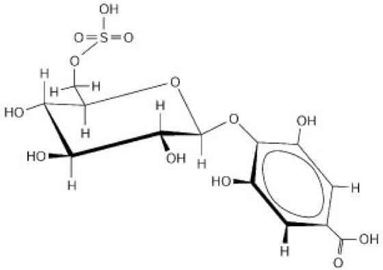 Strukturformel von PLMF1, 4-O-(β-D-Glucopyranosyl-6'-sulfat)gallussäure, dem wirksamsten der bisher isolierten Turgorine.