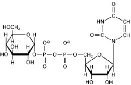 UDP-Glucosew, Uridindiphosphat-Glucose, Abk. UDPG, aktivierte Glucose; ein Nucleosiddiphosphat-Zucker, der als Zwischenprodukt bei vielen Stoffwechselreaktionen der Glucose gebildet wird, wie z.B. bei der Umwandlung von Glucose in Galactose und beim Einbau von Glucose in Saccharose, Glykogen und Cellulose. UDP-Glucose ( vgl. Abb. ) entsteht aus Glucose-1-phosphat und UTP (Uridin-5'-triphosphat) unter Freisetzung von Pyrophosphat. Gluconeogenese.