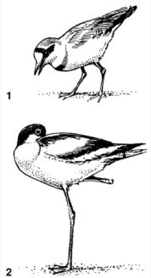 Übersprungverhalten bei Vögeln: 1 Flußregenpfeifer (Charadrius dubius) beim Futtersuchen im Übersprung ohne Nahrungsaufnahme, dabei Alarmruf gebend. 2 Säbelschnäbler (Recurvirostra avosetta) beim Übersprungschlafen, jedoch mit geöffnetem Auge zum Fixieren des Gegners (nach Simmons 1955)