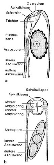 Scheitelregion a eines operculaten Ascus (Lachnea hemisphaerica),b eines inoperculaten Ascus (Microglossum lutescens) (nach Chadefaud)