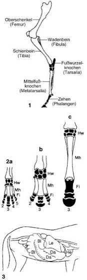 1 Hinterextremität des Pferdes. Man beachte die Verlängerung des Fußes (mit Fußwurzelknochen, Mittelfußknochen und Zehe) im Verhältnis zu Oberschenkel und Unterschenkel (mit Schienbein und Wadenbein). 2 Linke Vorderextremität (Hand) von a Tapir, b Nashorn, c Pferd. Fi Finger (Phalangen), Hw Handwurzelknochen (Carpalia), Mh Mittelhandknochen (Metacarpalia). 3 Eingeweide des Pferdes. Bl Blinddarm (graue Linie), Da aufsteigender und absteigender Ast des Dickdarms (Colon), He Herz, Le Leber.